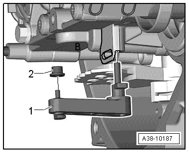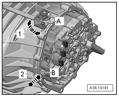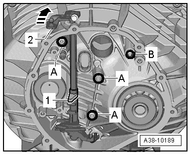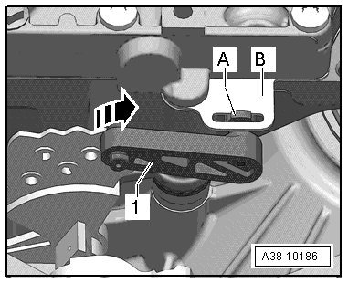 - Move the selector lever lock mechanism lever - 1 - to the left opposite the direction of - arrow -, by doing this, the retaining tab - A - will turn in the slot in the retaining plate and - B - will be held there.