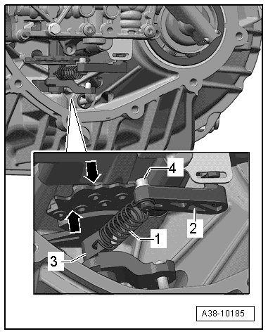 - Push the gearshift lever - 2 - in direction of - arrow - all the way forward so that the shifting cam - 1 - is almost vertical (slightly angled to the right).