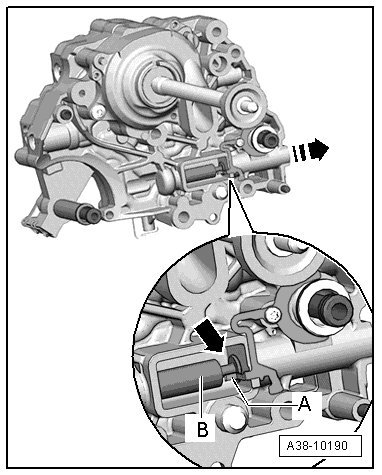 • When installing control module, make sure that shifting cam (item 1 in Fig. A38-10189 ) engages into free groove - arrow - on control piston - B -.
