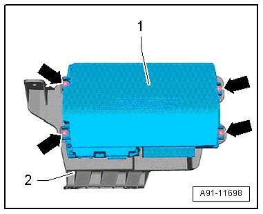 - Remove the nuts and bolts - arrows - from the bracket - 1 - and then remove the digital sound system control module - 2 - with the bracket - 1 -.