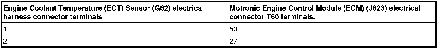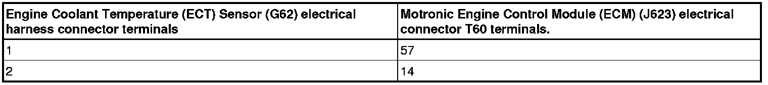 - Using a Multimeter, check the Engine Coolant Temperature (ECT) Sensor (G62) electrical harness connector terminals to the Motronic Engine Control Module (ECM) (J623) electrical harness connector T60 terminals for an open circuit according to the wiring diagram.