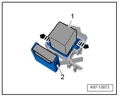 - Open the clips - arrows - and remove the relay - 1 - and the control modules from the relay panels.