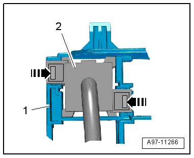 - Push the clip in - direction of arrow - and disengage the connector station - 1 - from the A-pillar.