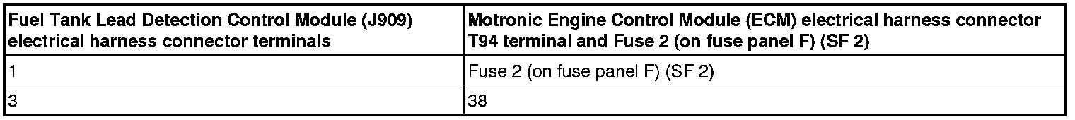 - also check the wiring from the Fuel Tank Lead Detection Control Module (J909) electrical harness connector terminal 1 to the Fuse 2 (on fuse panel F) (SF 2) for an open circuit or a short circuit to Ground (GND).