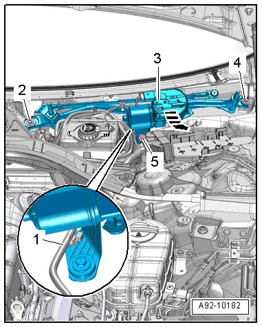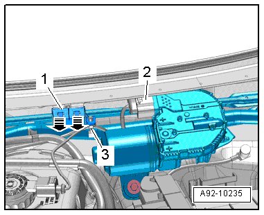 - Move the windshield wiper frame - 3 - with the linkage and windshield wiper motor slightly forward - arrow -.