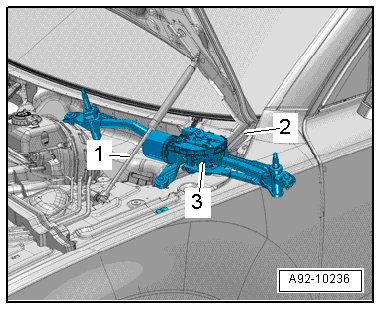 - Remove the windshield wiper frame - 3 - with the linkage and windshield wiper motor from the plenum chamber between the gas-filled strut - 1 - and the hood hinge - 2 -.