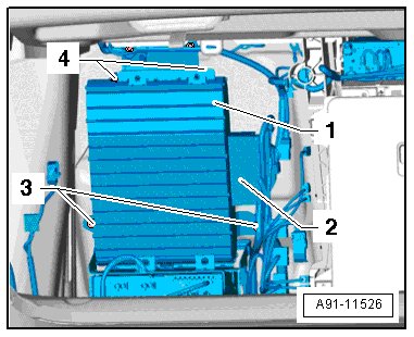 - Remove the nuts - 3 and 4 - and remove the bracket - 1 - with the digital sound system control module 2 from the luggage compartment.