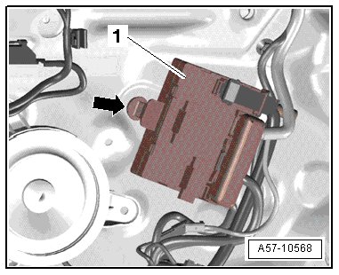 - Press the tab in - direction of arrow - and disengage the door control module - 1 - from the door shell.