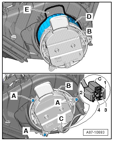 - Remove the fresh air blower (with the fresh air blower control module) - B - from air intake housing - E -.