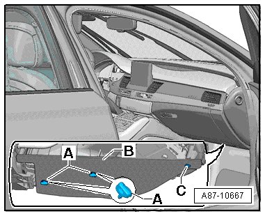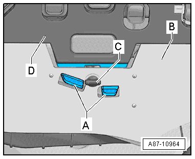• There are retaining straps with hooks - A - at the glove compartment - D - that act as assembly aids, and which are installed in the noise insulation openings - B - as shown in the illustration. If the glove compartment - D - is not installed correctly ( press the retaining straps with hooks - A - from underneath against the noise insulation - B -), the noise insulation - B - can only be removed if the glove compartment is already removed.
