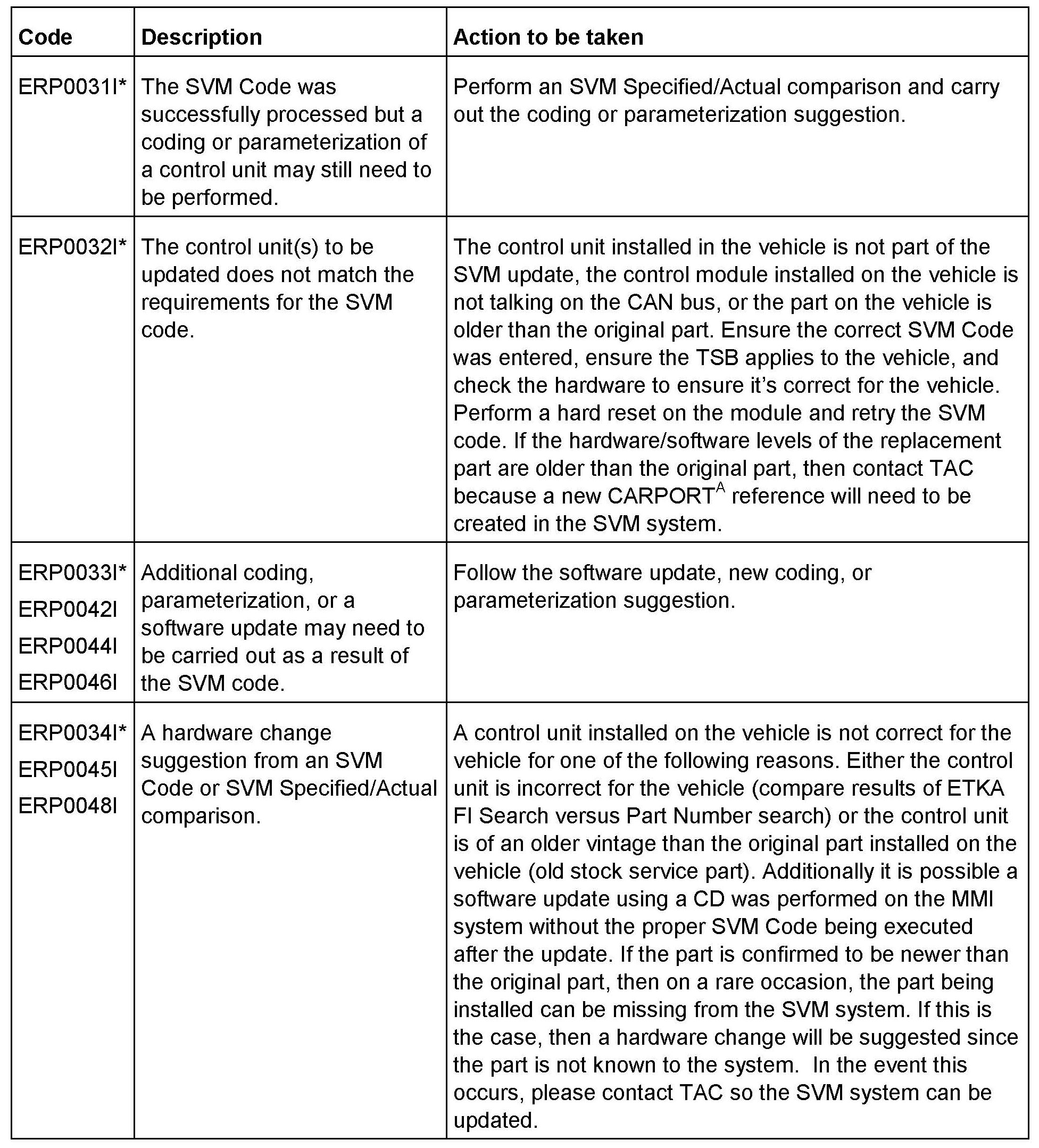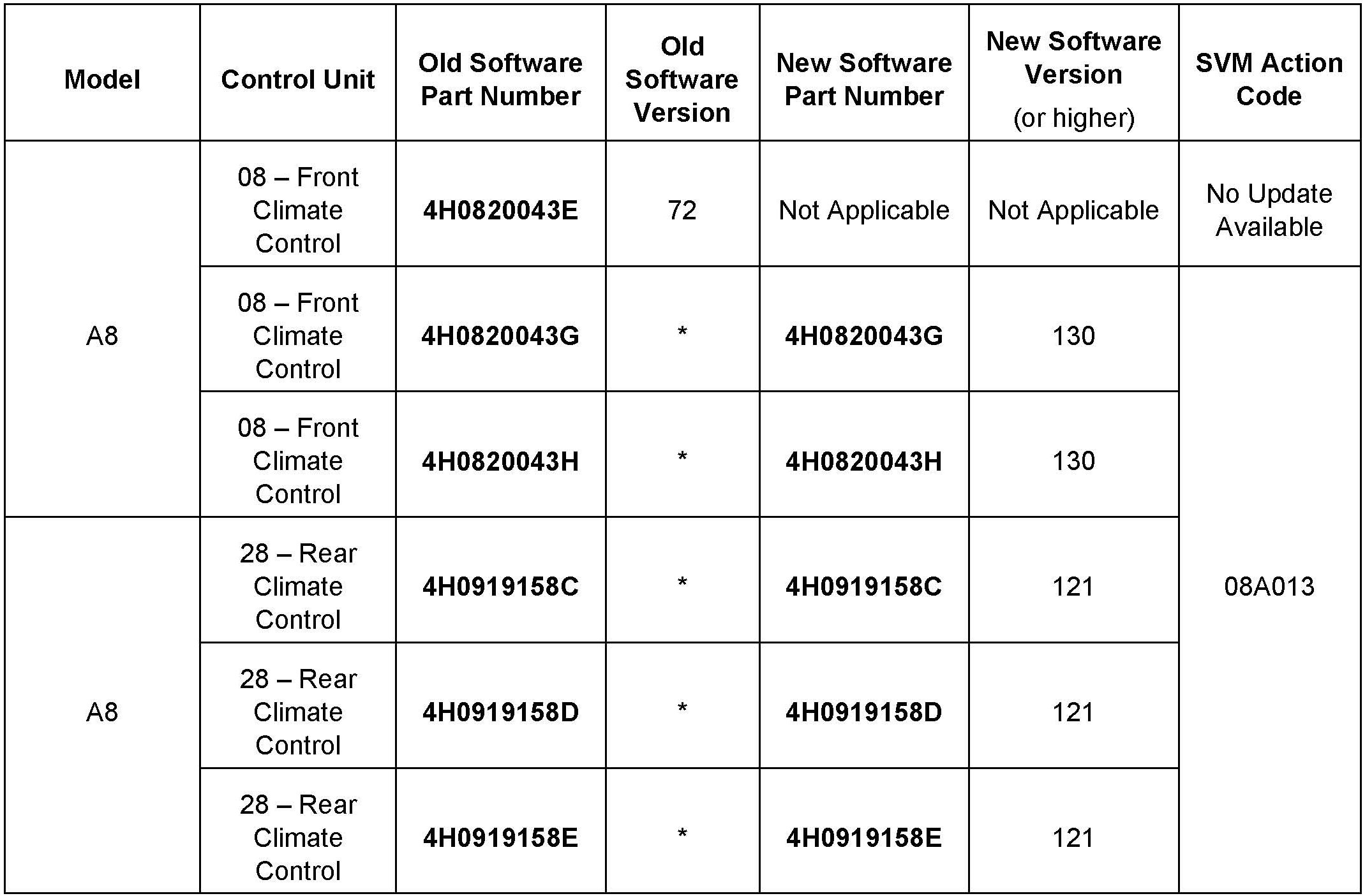 2. Update the Climatronic control module, J255 (08), using the SVM action code as listed in the table below, if necessary.