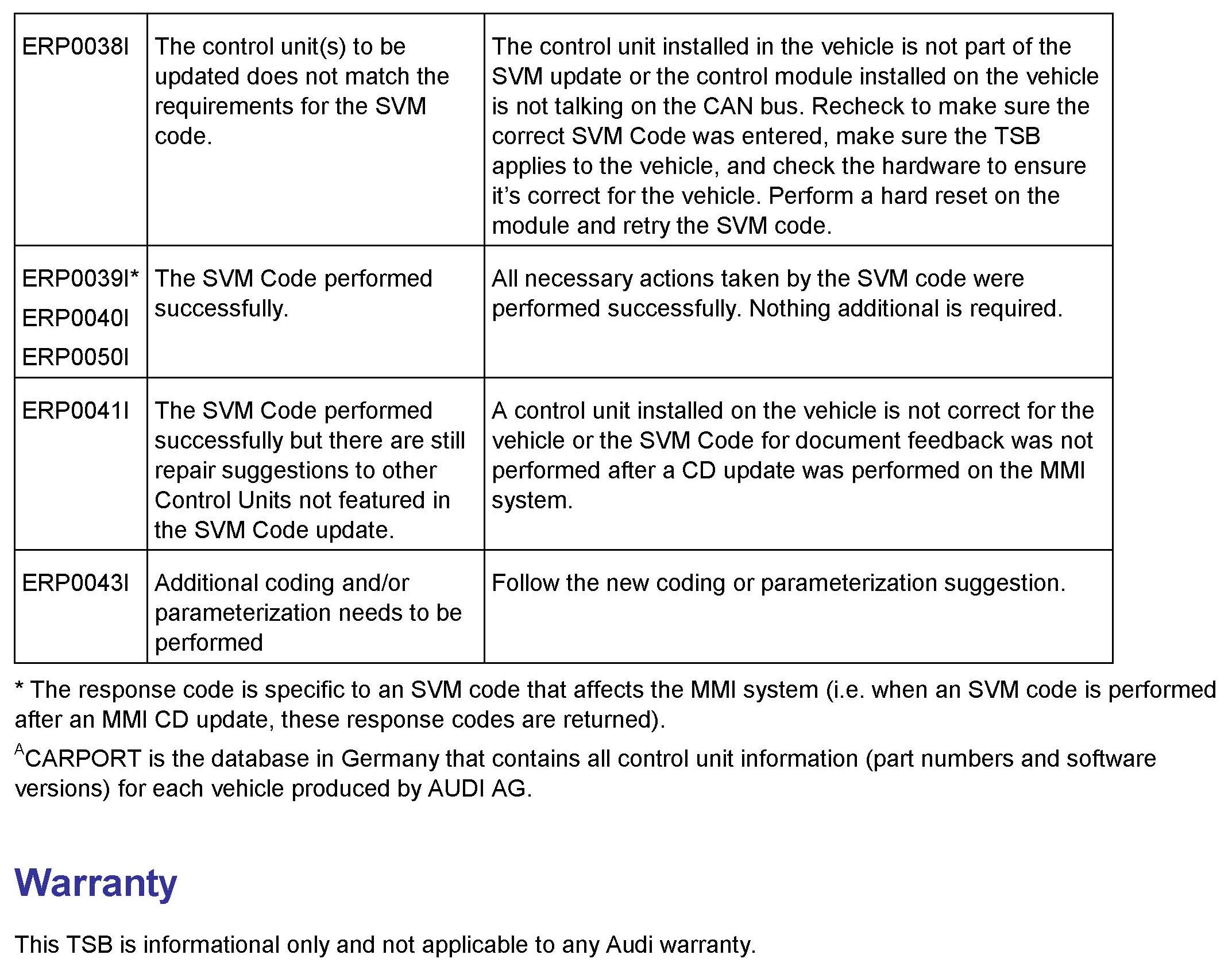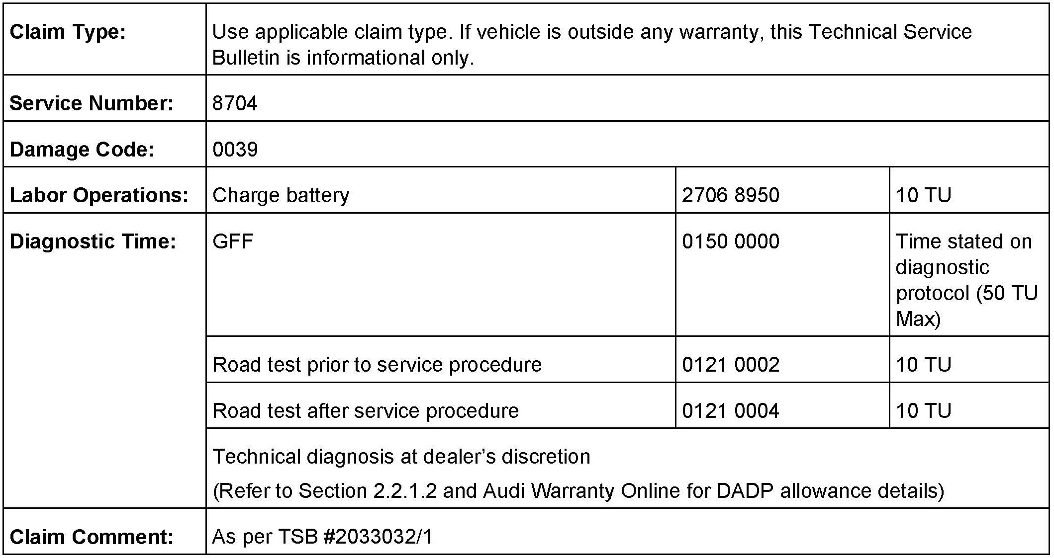 All warranty claims submitted for payment must be in accordance with the Audi Warranty Policies and Procedures Manual. Claims are subject to review or audit by Audi Warranty.