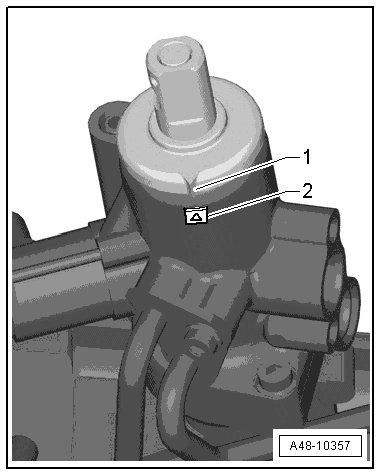 The point - 1 - must be opposite the marking - 2 -. The distances of the tie rod ends to the steering gear must be the same at the left and right.