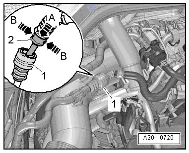 - First push the hose coupling - 2 - downward - arrow A -, then press the release buttons - arrows B -.
