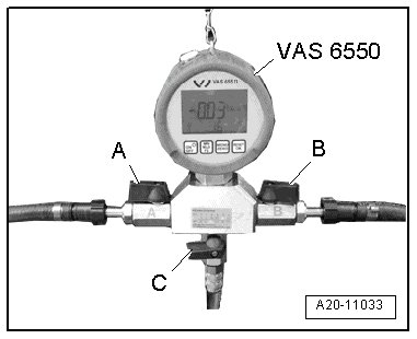 • In order to measure the fuel delivery rate, there must be an initial pressure inside the fuel line against which the fuel pump must work during the measuring. Adjust the initial pressure using (VAS 6550) as follows: