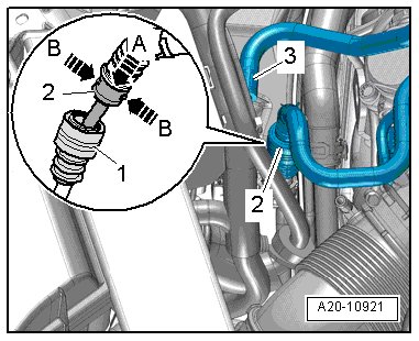 - First push the hose coupling - 2 - downward - arrow A -, then press the release buttons - arrows B -.