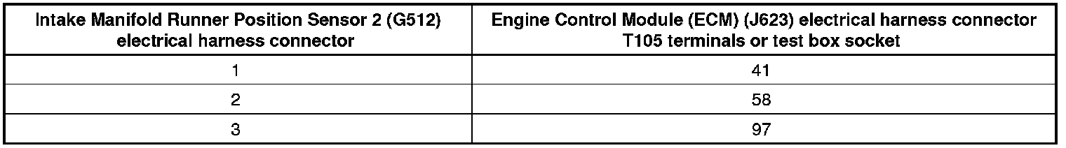 - Using a multimeter , check the Intake Manifold Runner Position Sensor 2 (G512) electrical harness connector terminals to the Engine Control Module (ECM) (J623) electrical harness connector T105 terminals for an open circuit.