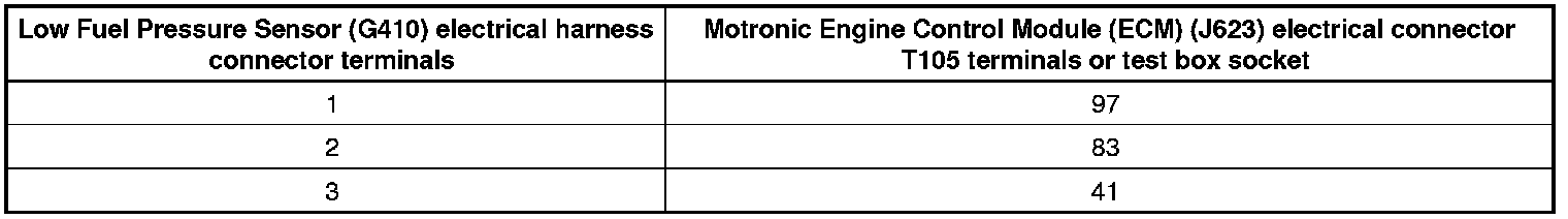 - Using a multimeter, check the Low Fuel Pressure Sensor (G410) electrical harness connector terminals to the Motronic Engine Control Module (ECM) (J623) electrical harness connector T105 terminals for an open circuit according to the wiring diagram.