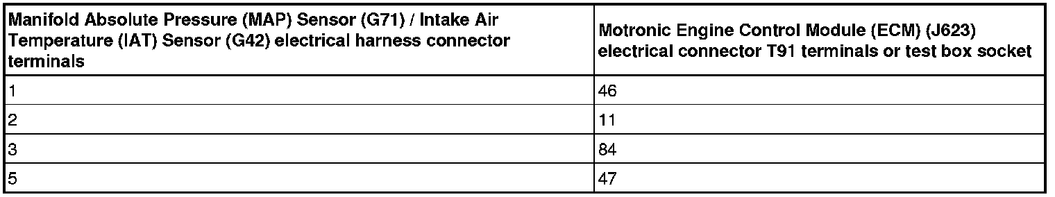 - Using a multimeter , check the Manifold Absolute Pressure (MAP) Sensor (G71) / Intake Air Temperature (IAT) Sensor (G42) electrical harness connector terminals to the Motronic Engine Control Module (ECM) (J623) electrical harness connector T91 terminals for resistance.