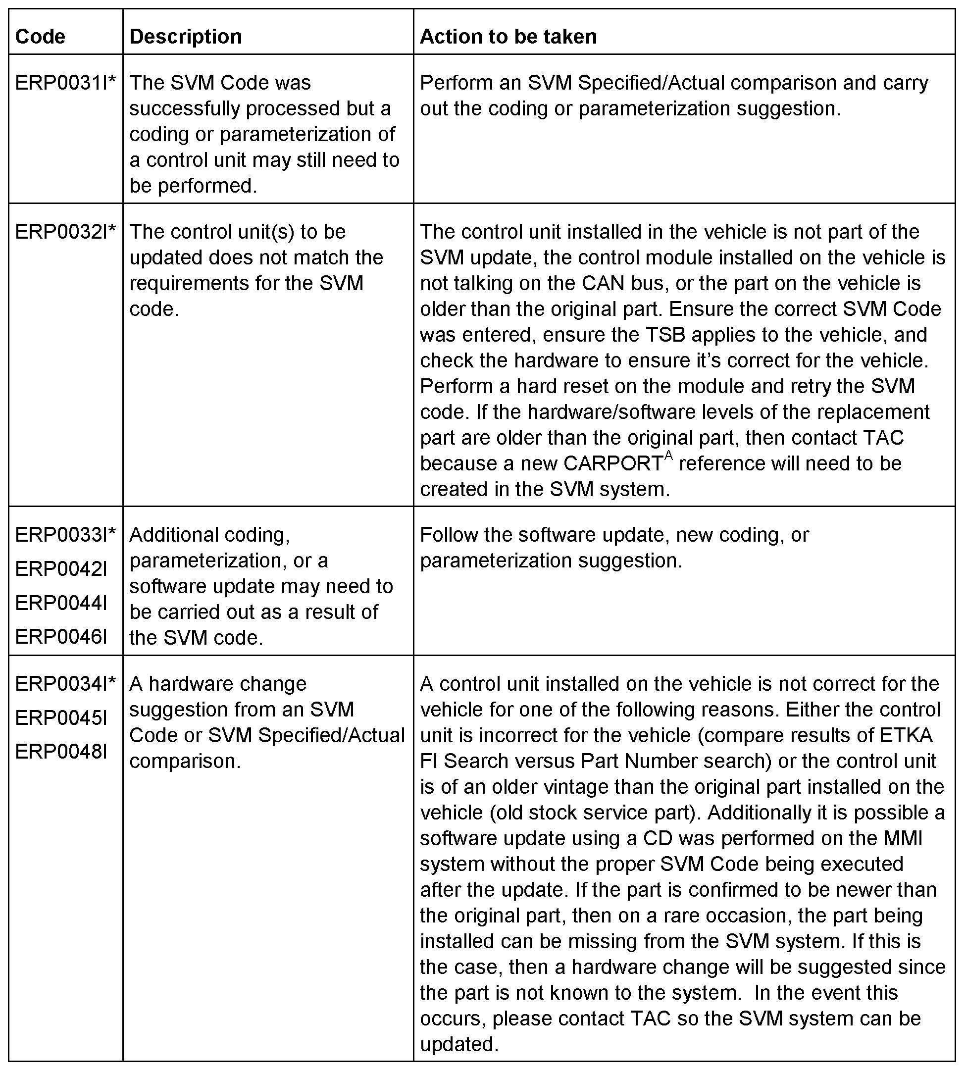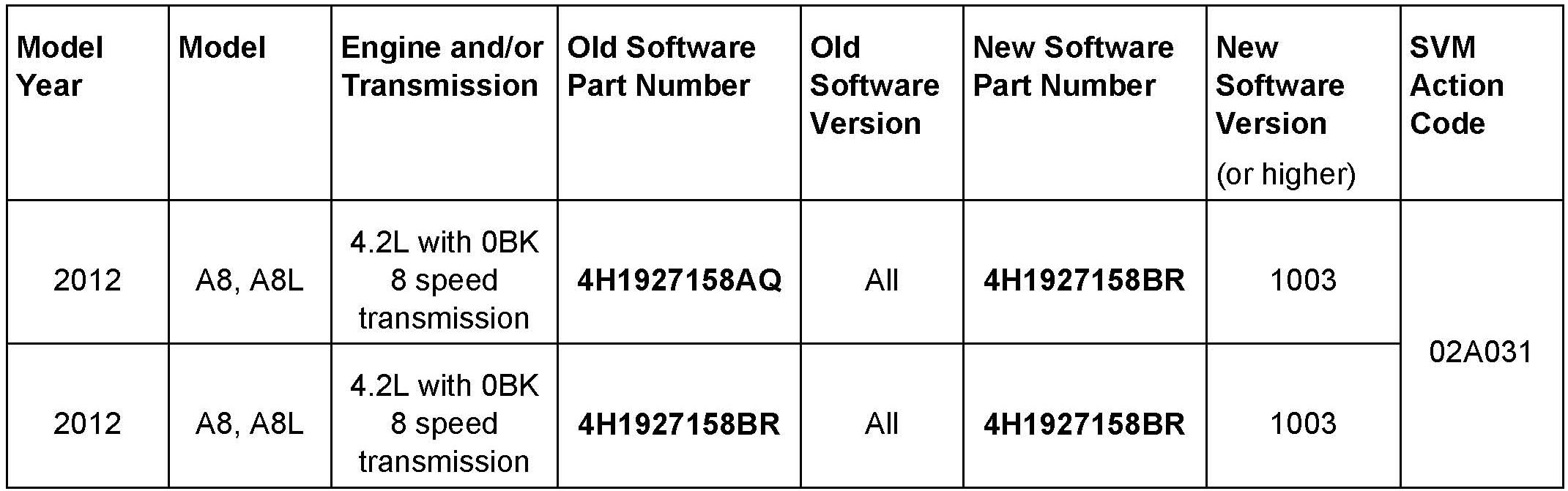 2. Update the transmission control module, J217 (02), using the SVM action code as listed in the table if necessary.
