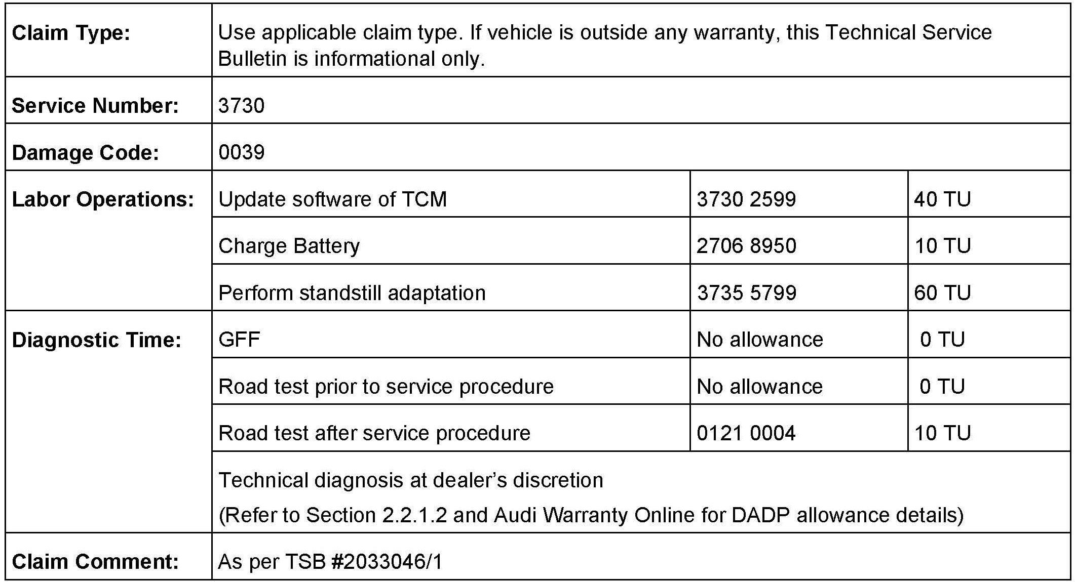 All warranty claims submitted for payment must be in accordance with the Audi Warranty Policies and Procedures Manual. Claims are subject to review or audit by Audi Warranty.