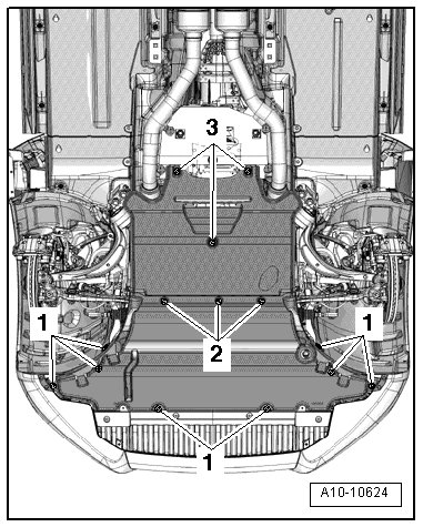 - Remove noise insulation, to do this loosen mounting parts - 1, 2, 3 -.