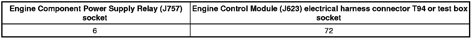 - Check the Engine Component Power Supply Relay (J757) socket 6 to the Engine Control Module (J623) electrical harness connector T94 terminal 72 for an open circuit or a short to Battery (+).
