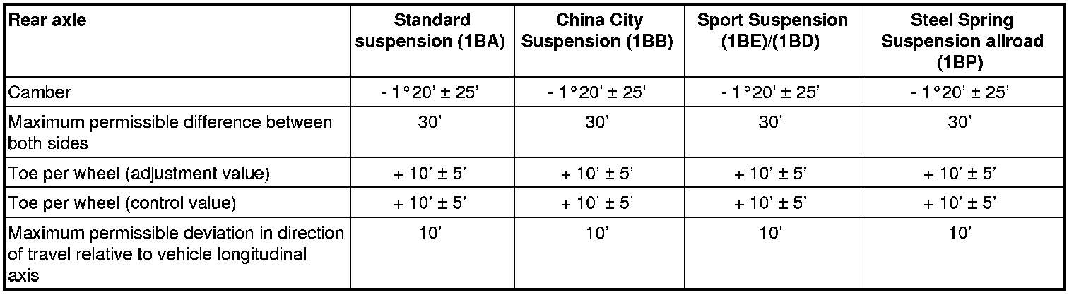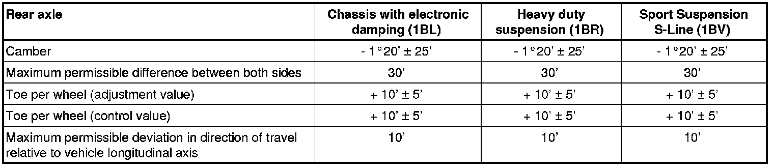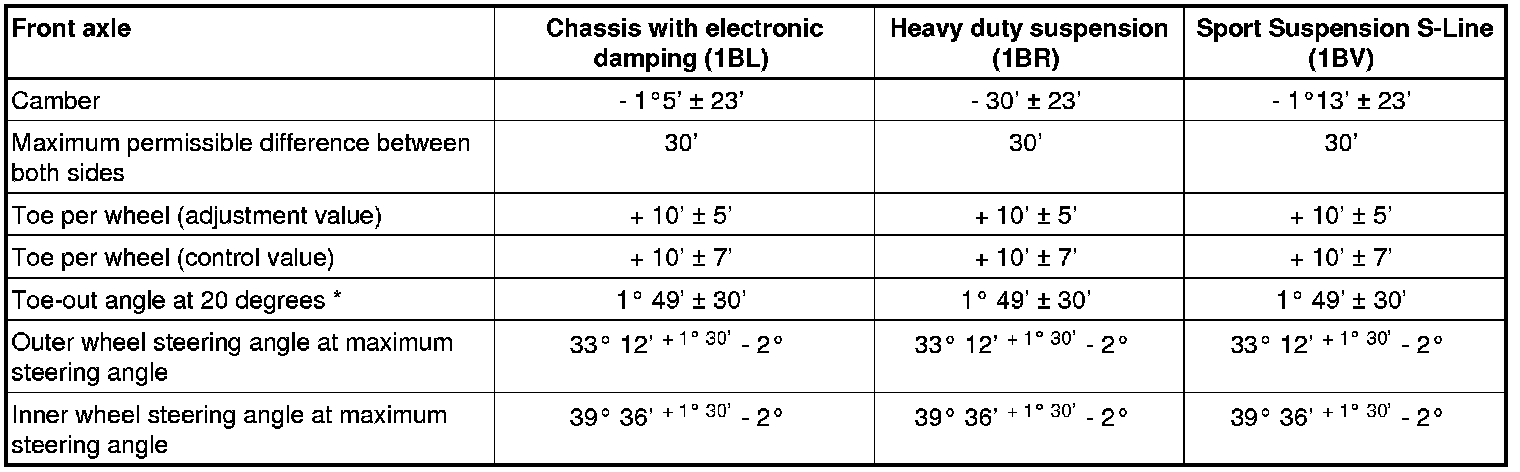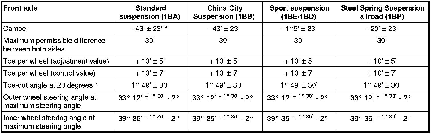 The camber values are defined in the following table based on the vehicle heights at the front axle.