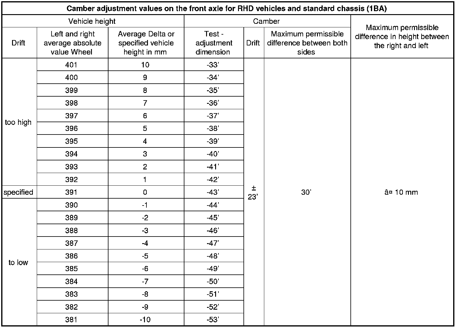 Camber adjustment values on the front axle for RHD vehicles and standard chassis (1BA)