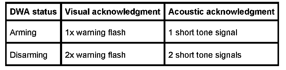 Triggering this "panic" mode triggers an acoustic and visual alarm irrespective of the current DWA state. "Panic" mode is terminated by disarming or arming the antitheft alarm system (DWA) as well as by unlocking the doors with the key.