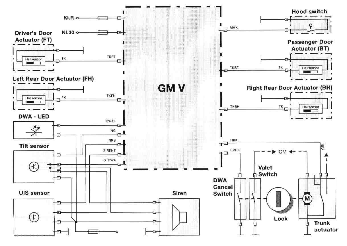 The siren has four wires connecting it to the system; KL 30, KL 31, Signal STDWA (arm/disarm signal from GM), and Signal NG (activate siren output signal to the GM)