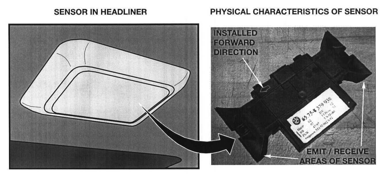 The interior sensor is mounted in the center of the headliner panel even with the "B" pillar. Due to the design of the vehicles interior, the sensor is uni-directional and must be installed in the proper direction to ensure proper operation of the system (trim cover ensures directional installation).