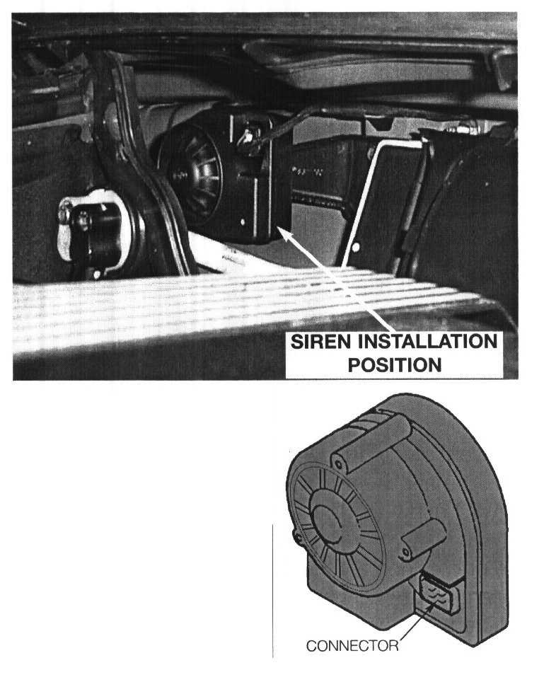 The siren from the DWA accessory kit is installed in the vehicle cowl on the passenger side of the vehicle. This location provides a secure position with loud acoustic output.