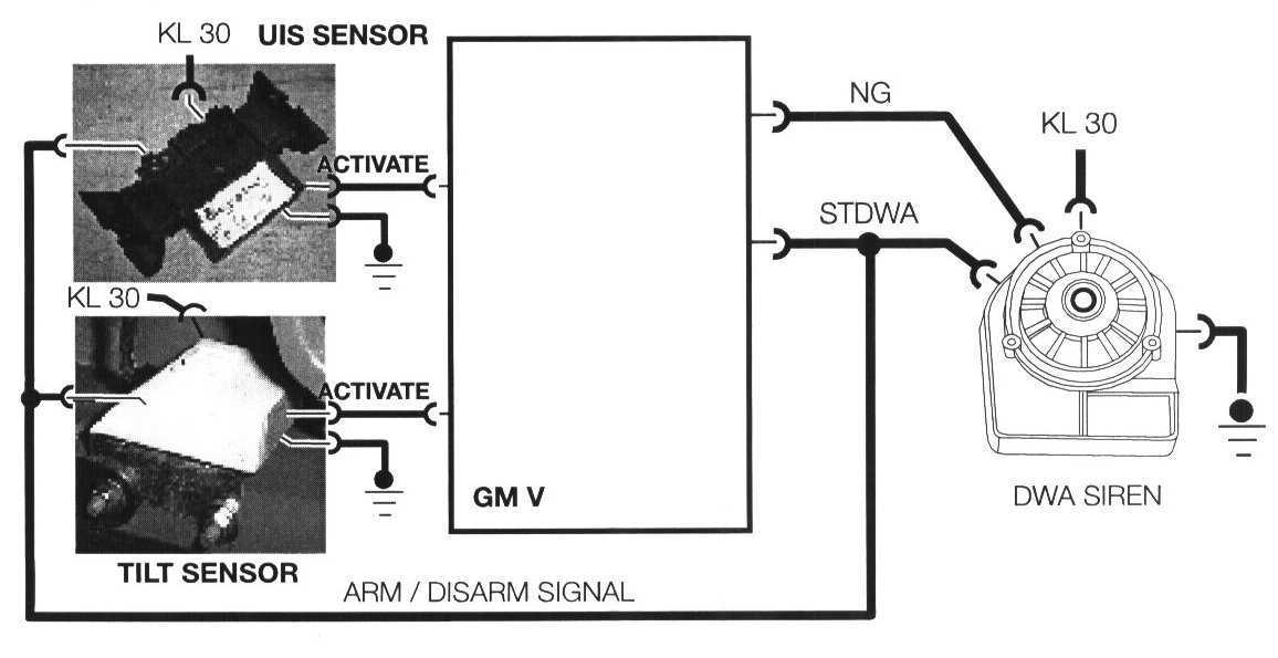 The arm/disarm output signal from the GM (STDWA) is provided to the Tilt sensor, FIS sensor and the siren simultaneously. The arm/disarm signal is a switched ground that signals the components of DWA armed/disarmed status.