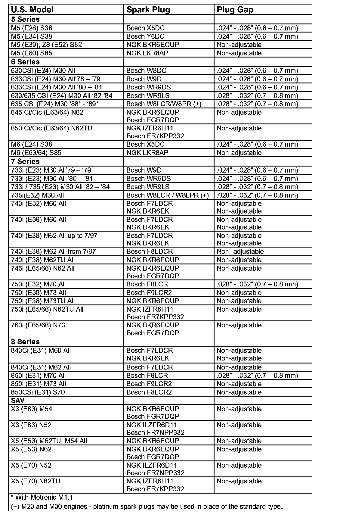The changes are reflected in the spark plug chart, which now includes updated information on the E90 3 Series, E60 5 Series, E63/64 6 Series, E65/66 7 Series, E85 Z4, E83 X3 and E53/E70 X5.