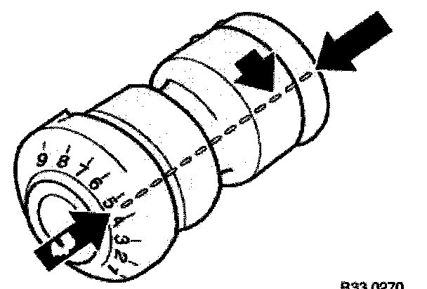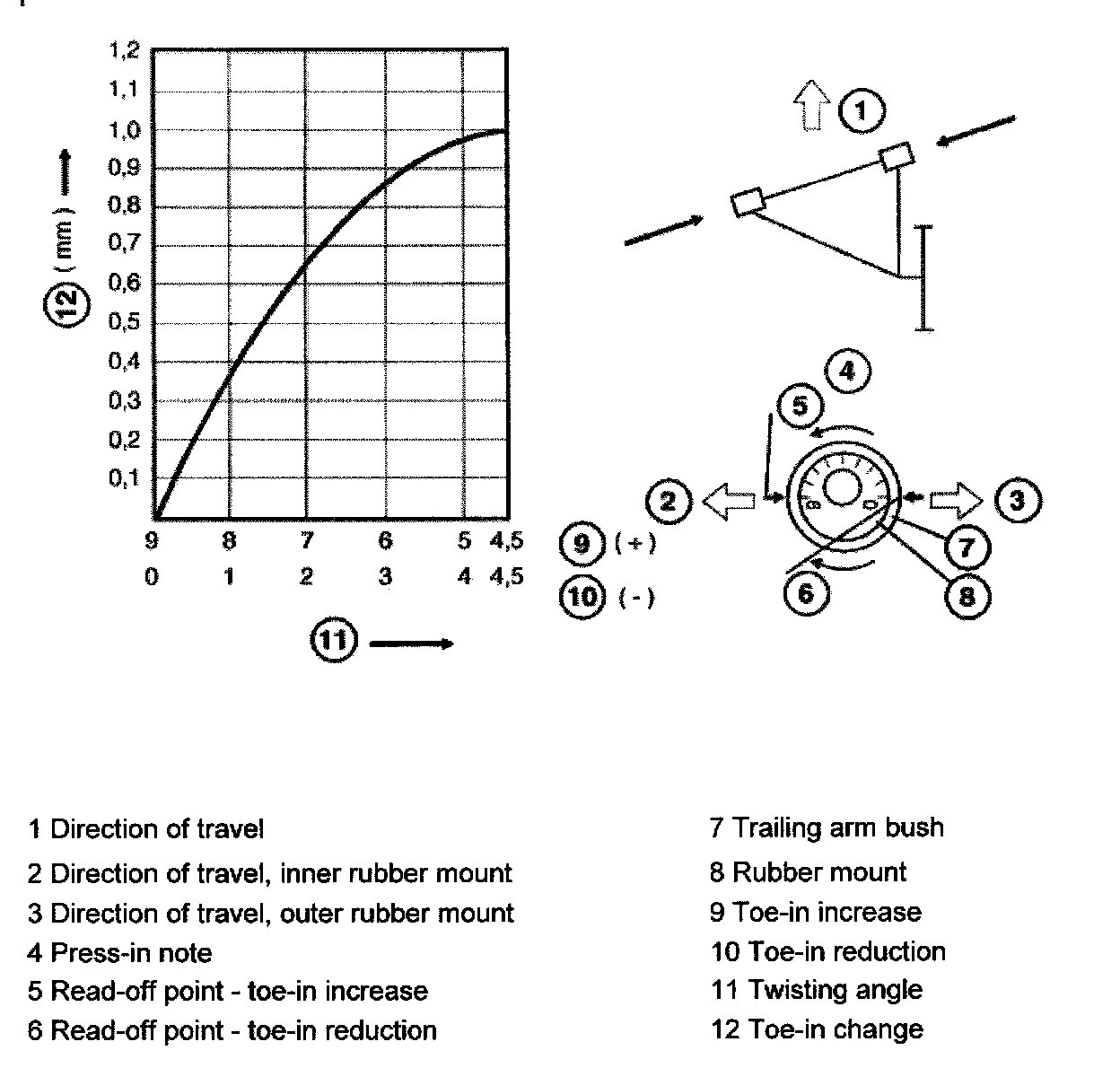 Coat eccentric rubber mount (1) with Circolight, or equivalent and position on trailing arm so that artificial line matches up with marking on trailing arm bush. In so doing, note whether toe-in increase or reduction is to be achieved, refer to diagram below (read-off point).