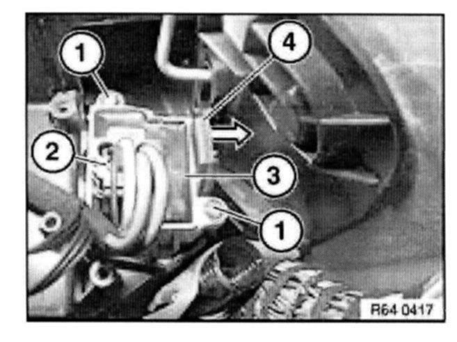 Undo lock in direction of arrow and remove output stage/switch for heater - A/C system blower (3).