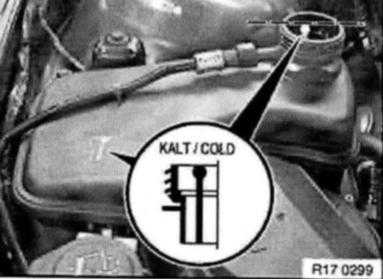 Before filling, turn on ignition. Set heating controller to maximum temperature. Set blower to low setting. In this way, the heater valves are opened and the auxiliary delivery pump fitted if necessary operates.
