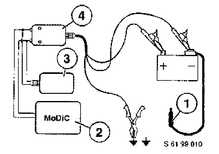 Connect (3) MoDiC adapter 61 2 310 in parallel to (4) adapter for closed-circuit current measurement 61 3 300. Connect measuring lead MFK1 to MoDiC (2) and select multimeter measurement function voltage V in the mask.