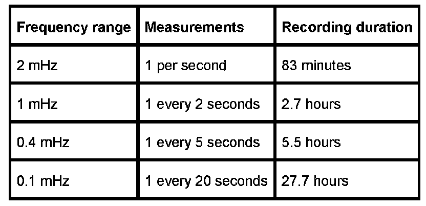 The frequency range is selected after pressing the recorder mode button on the shield. The frequency range determines how often a measured value is acquired and for how long the measured values are recorded. The higher the frequency the more often a measured value is recorded and the shorter the saved recording duration.