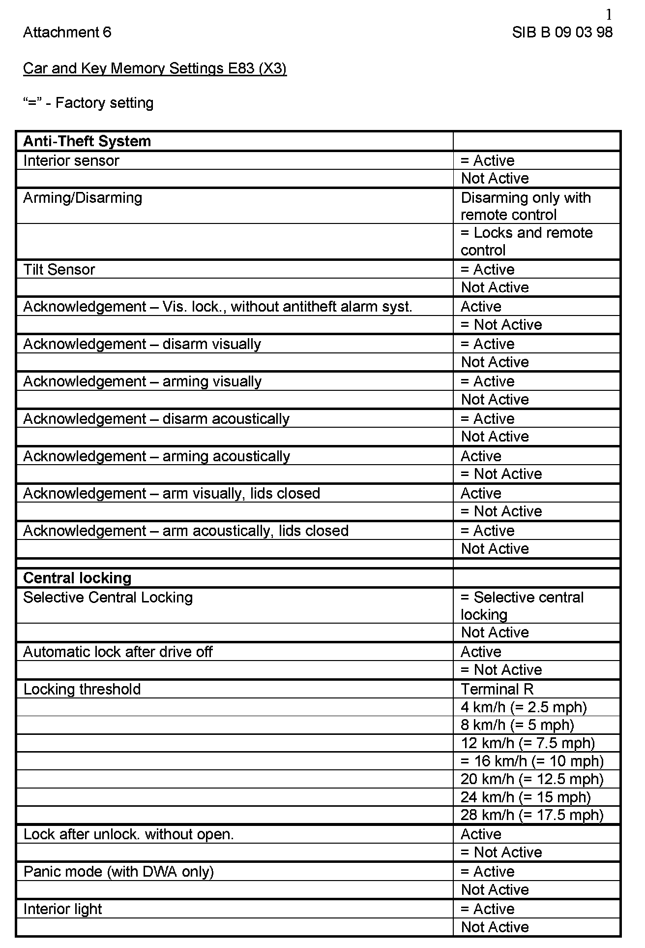 Attachment "B090398_Att6_CKM_E83" itemizes all available "Car and Key Memory" options for the E83 vehicles.