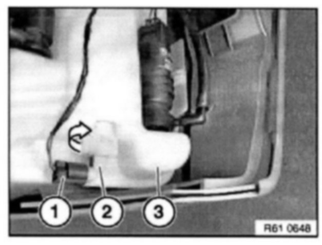 Turn level switch for windshield washer system (2) in direction of arrow and remove towards bottom from water reservoir for windshield washer system (3).