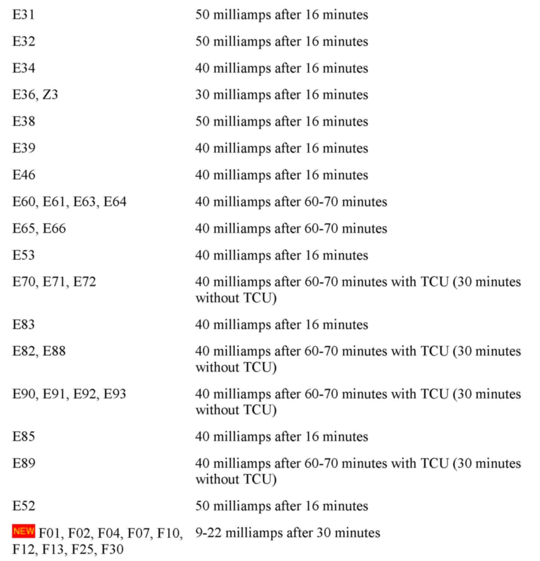 ^ Normal closed-circuit current values for E65, E70, E60, E61, E63, and E64