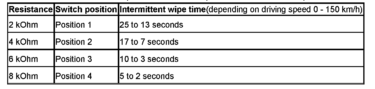 Intermittent wipe is activated in the first setting of the wiper switch. The intermittent wipe time can be set by means of a rotary switch on the wiper switch in four stages. The intermittent wipe time is also influenced by the driving speed.