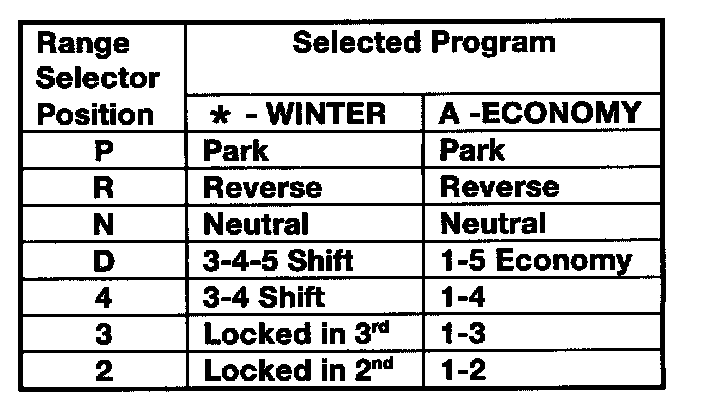 "*" - selection provides a winter program providing the following gear shift possibilities based on the range selector position.