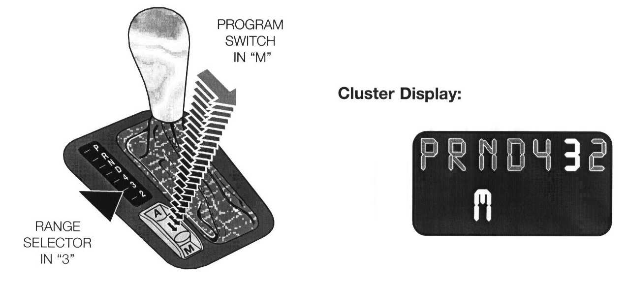 "M" selection provides a manual shift program that engages only the gear selected. Automatic up/down shift's possible. Moving the range selector manually provides gear shifting.