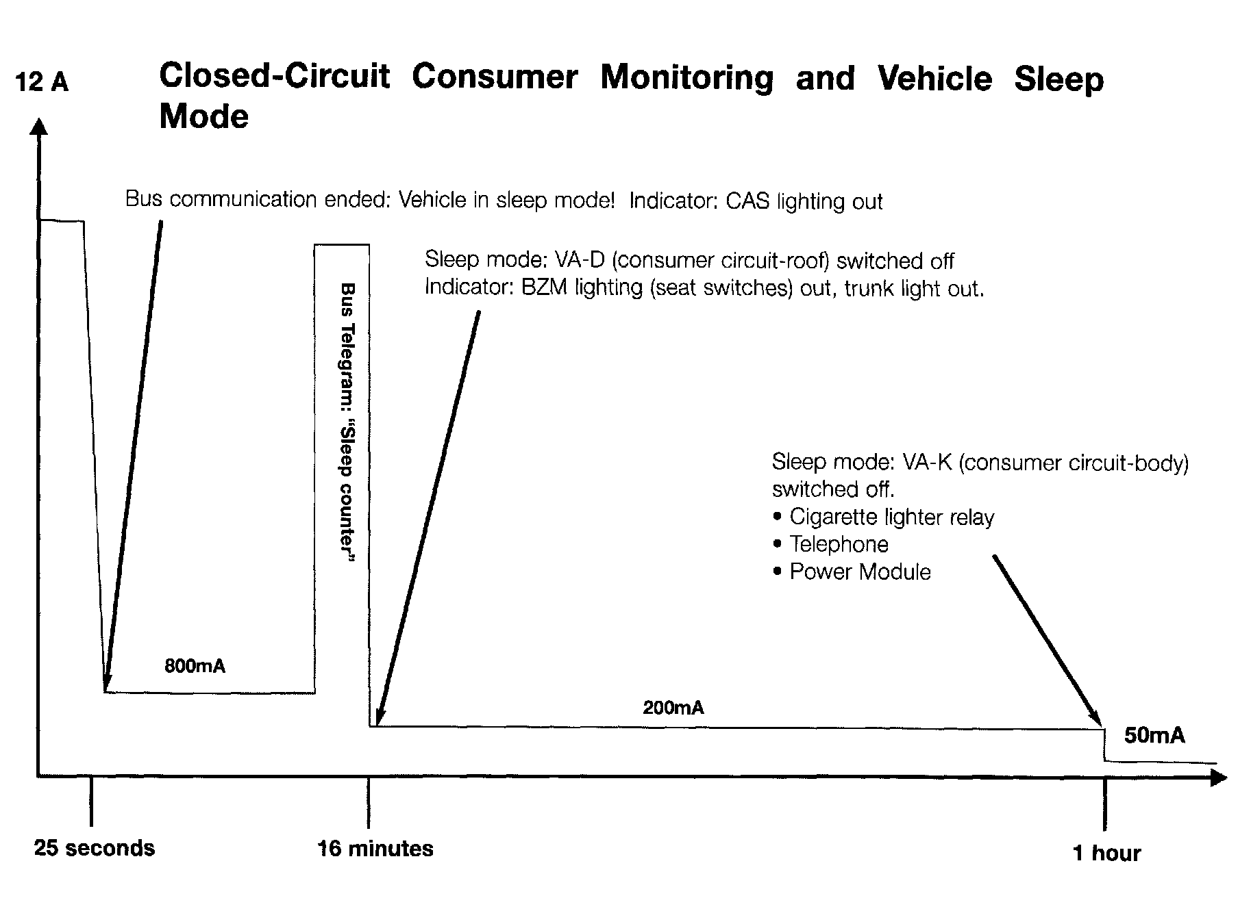 When terminal R is switched off, current monitoring is also immediately activated. Normal current load on the vehicle drops in stages according to the vehicle programming for sleep mode.