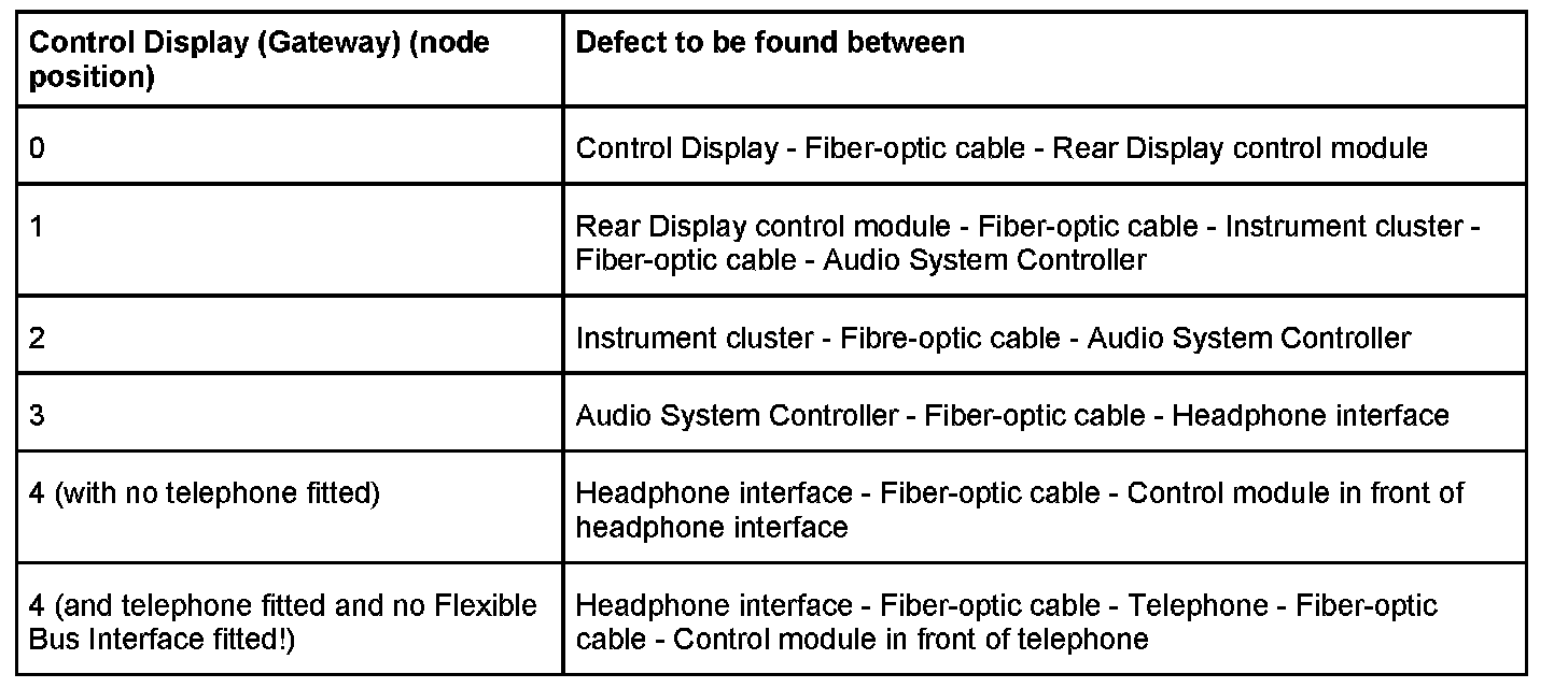 Example (control module Rear Display not fitted): The Audio System Controller control module has stored the relative node position 0. The instrument cluster therefore stores the relative node position 1 and the Control Display (Gateway), the relative node position 2. Node position 2 can be read out by the Control Display (Gateway). Thus, on the basis of the node position stored on the Control Display (Gateway) and the details of the MOST control modules fitted on the vehicle, it is possible to locate the position of the fault in the ring by simply counting backwards from the Control Display (Gateway):