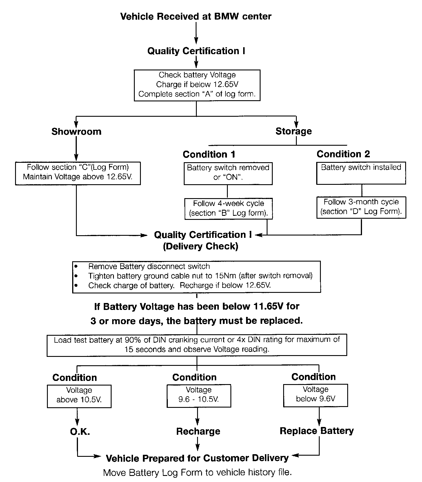 Because of the high consumer demand on vehicles that are being displayed and not driven, a four week charging cycle is not enough. For vehicles in the showroom the battery has to be charged as frequently as necessary to ensure that the battery never drops below 12.5 V. Use the "C" portion of the log form (Display Vehicle - Monitored Daily) to keep track of the charging and checking of the battery.