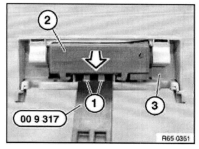 Press down retaining lugs (1) with special tool 00 9 317 and remove module for passenger compartment sensor (2) in direction of arrow from housing (3).